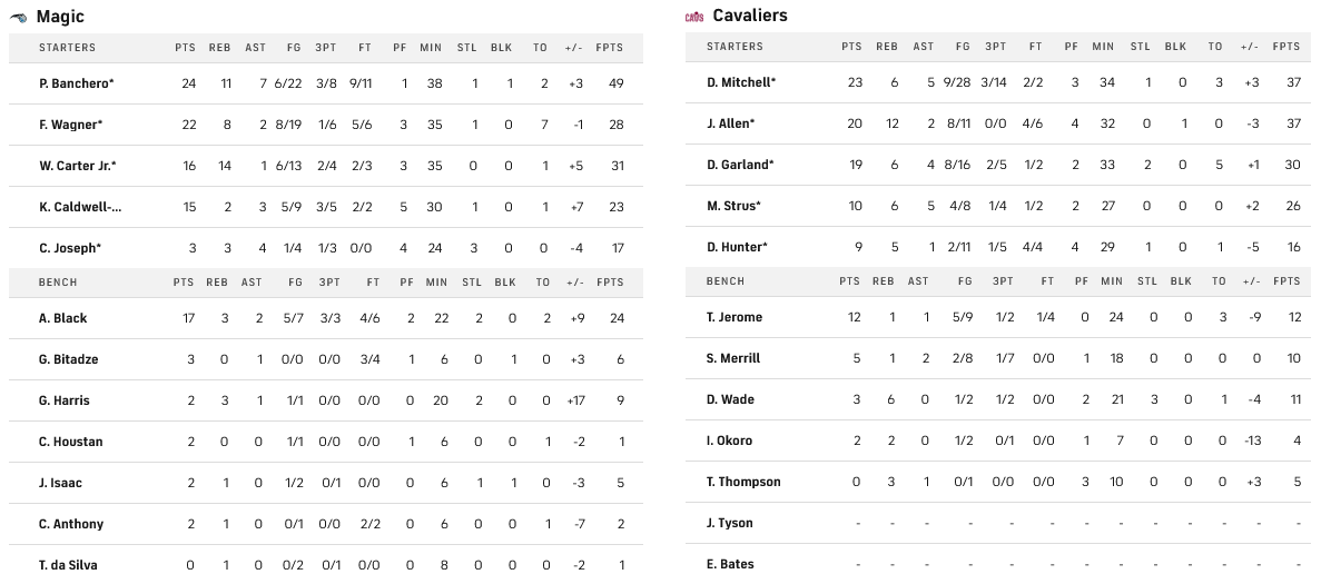 Σπουδαία νίκη για τους Μάτζικ μ΄εσα στην έδρα των Καβαλίερς, καθώς βρίσκονταν να ακολουθούν με διψ΄ηφιες διαφορές στο μεγαλύτερο μέρος του αγώνα, όμως στο δεύτερο ημίχρονο ανέβασαν στροφές, έκανα την ανατροπή και επικράτησαν με 108-103.