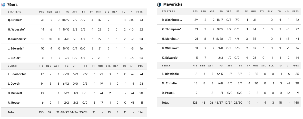 Οι Σίξερς ήταν σταθερά ανώτεροι από τους Μάβερικς στο μεγαλύτερο διάστημα της αναμέτρησης και παρά το γεγονός ότι δεν κατάφεραν να πάρουν ένα ασφαλές προβάδισμα, τελικά επικράτησαν με 130-125 μέσα στο Ντάλας.