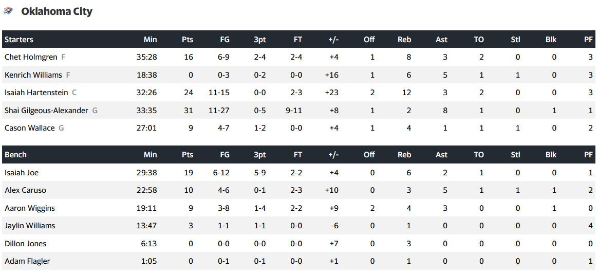 Πρωταγωνιστής των νικητών για άλλη μια φορά ο Σάι Γκίλτζεους-Αλεξάντερ, που πέτυχε 31 πόντους και 8 ασίστ, ενώ ακολουθεί ο Ιζάια Χάρτεστεϊν με 24 πόντους και 12 ριμπάουντ.