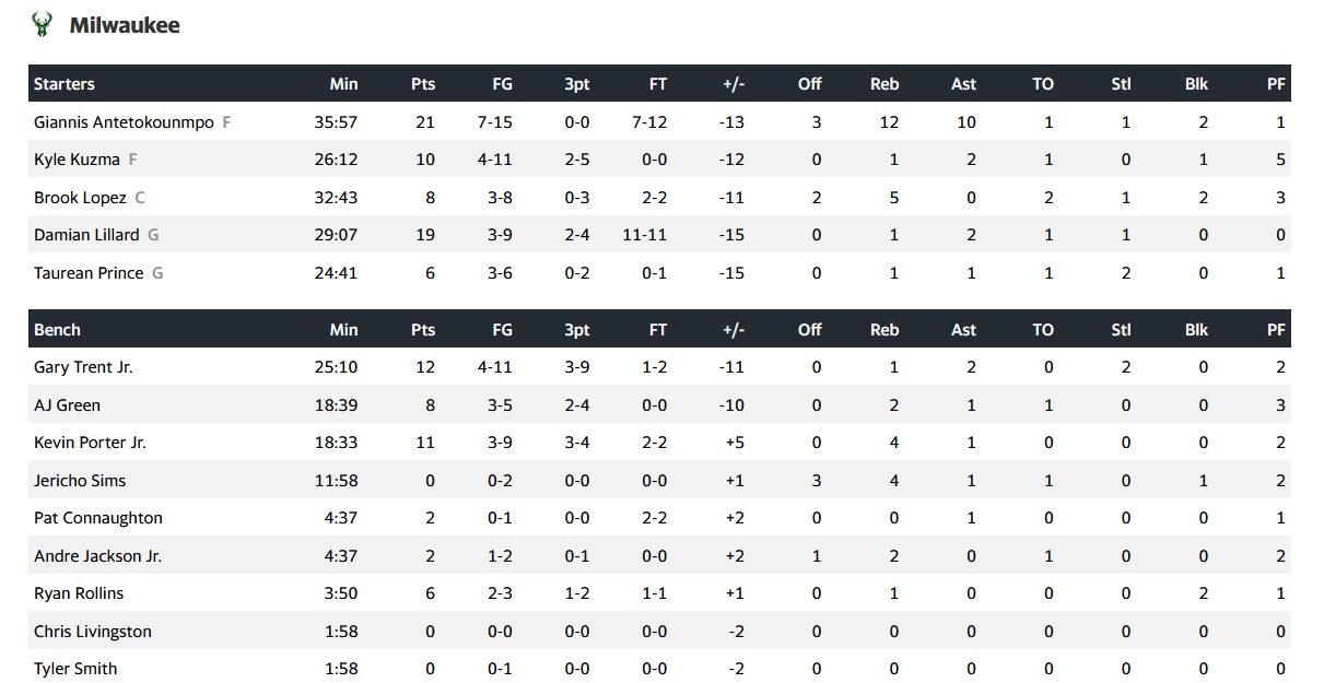 Από την άλλη, από τα Ελάφια ξεχώρισε ο Γιάννης Αντετοκο΄υνμπο με 21 πόντους, 12 ριμπάουντ και 10 ασίστ, καθώς και ο Ντάμιαν Λίλαρντ με 19 πόντους και το απόλυτο σκορ των 11-11 ελεύθερες βολές.