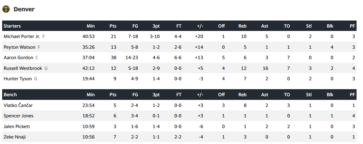 Aπό τους νικητές πρωταγωνιστής της αναμέτρησης ήταν ο Άρον Γκόρντον που πέτυχε 38 πόντους και 6 ριμπάουντ, ενώ ακολουθεί ο Μάικλ Πόρτερ Τζούνιορ με 21 πόντους, 10 ριμπάουντ και 5 ασίστ.