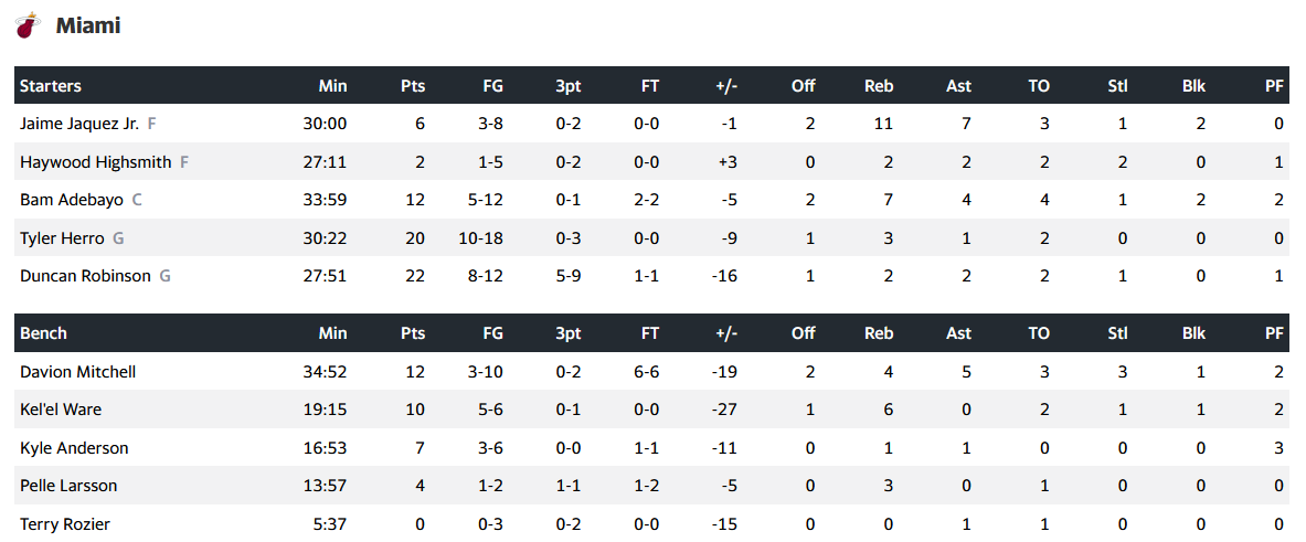 Από την ομάδα του Μαϊάμι ξεχώρισε ο Ντούνκαν Ρόμπινσον με 22 πόντους, ο Τάιλερ Χίροου με 20 πόντους, καθώς και ο Τζέιμι Ζακέζ με 11 ριμπάουντ και 7 ασίστ.