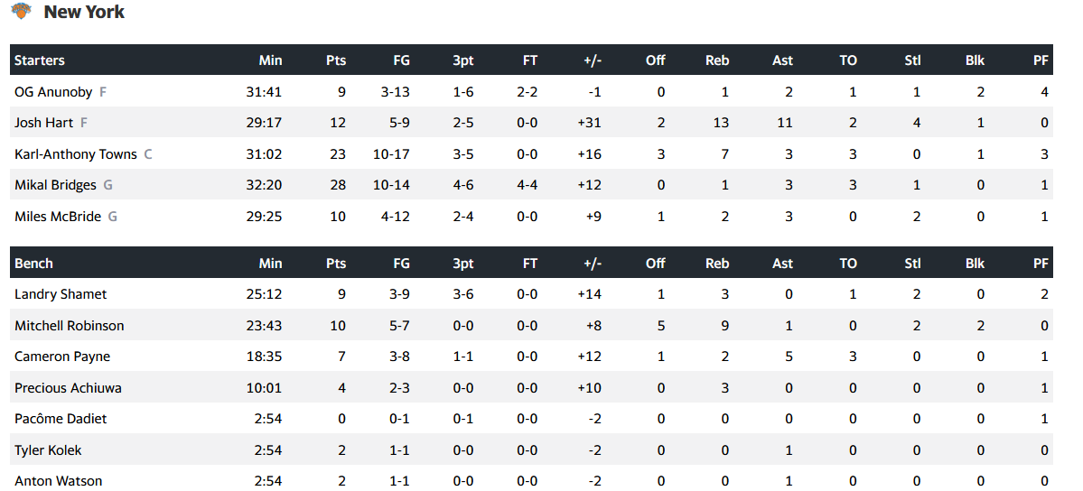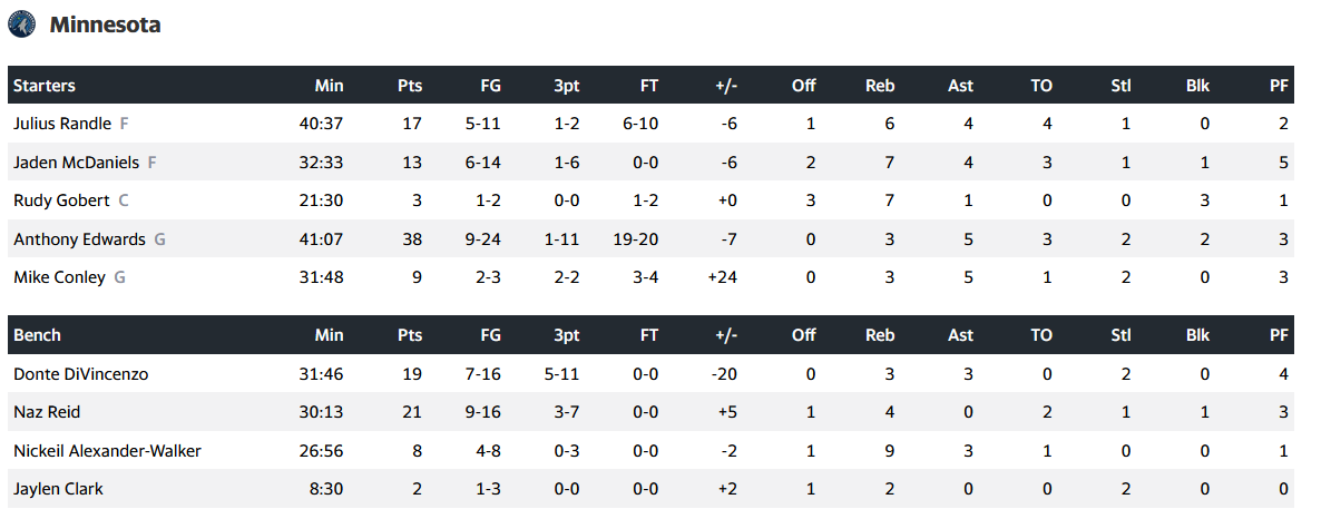 Από τους νικητές, πολύ καλή επίδοση πραγματοποίησε ο Μάικαλ Μπρίτζις με 28 πόντους, ο Καρλ-Άντονι Τάουνς με 23 πόντους και 7 ριμπάουντ, καθώς και ο Τζος Χαρτ με 13 ριμπάουντ και 11 ασίστ.