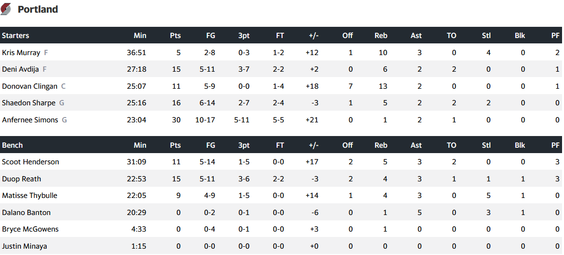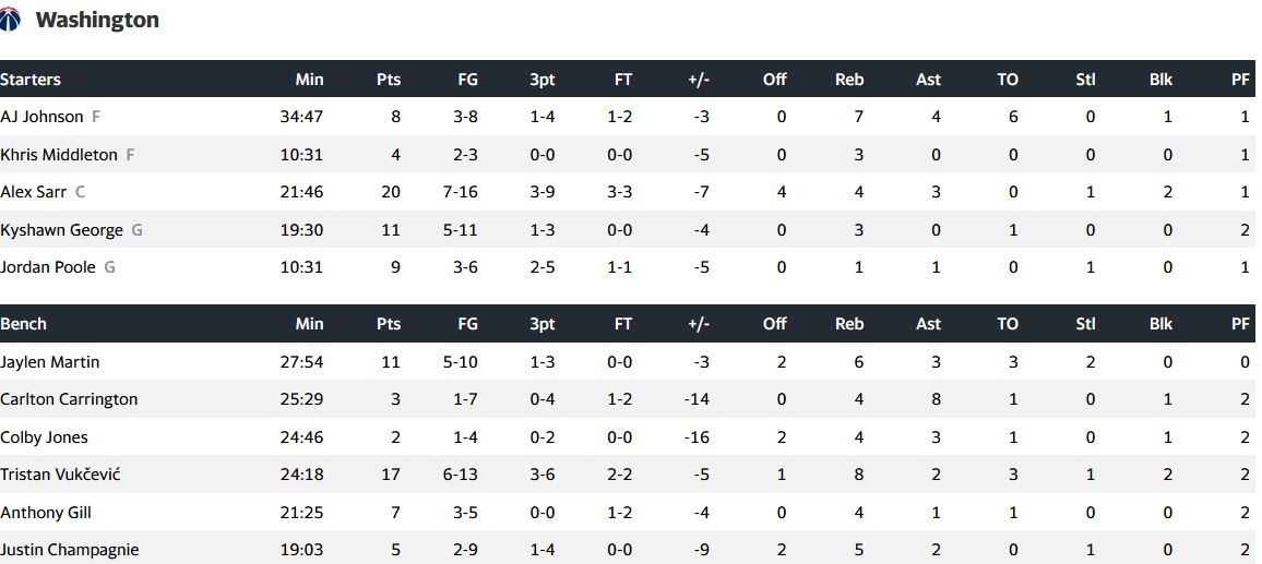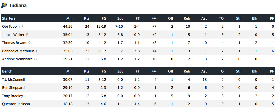 Από την ομάδα της Ιντιάνα, ξεχώρισε ο Όμπι Τοπίν με 34 πόντους και 10 ριμπάουντ, καθώς και ο Μπένεντικτ Μάθουριν με 22 πόντους.