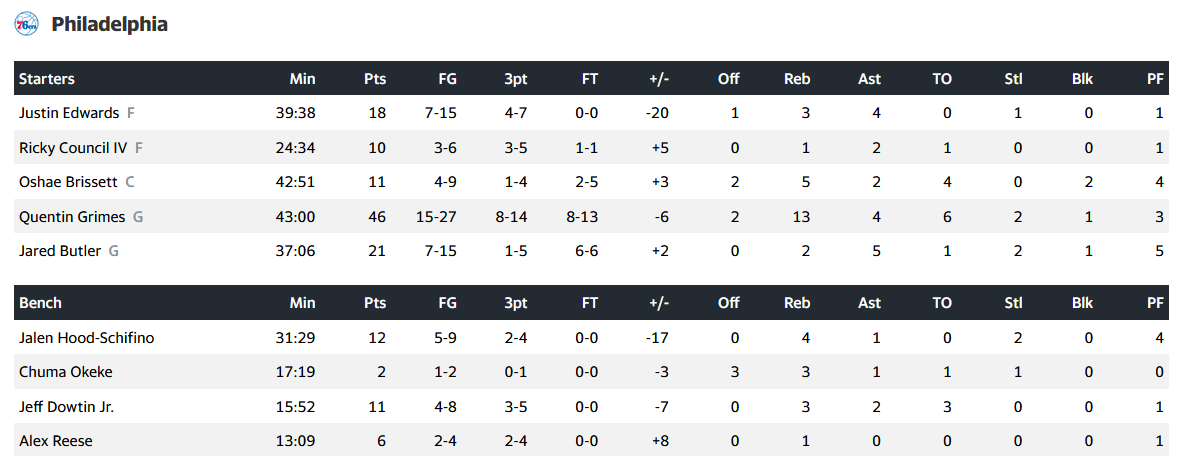 Aπίστευτος Κουέντιν Γκριμς από Φιλαδέλφια, που πέτυχε 46 πόντους και μάζεψε 13 ριμπάουντ, ενώ με διαφορά ακολουθεί ο Τζάρεντ Μπάτλερ με 21 πόντους.