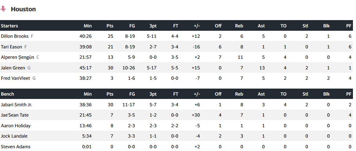 Από τους νικητές πρωταγωνιστής ήταν ο Τζέιλεν Γκριν με 30 πόντους, 13 ασίστ και 7 ριμπάουντ, καθώς και ο Τζαμπάρι Σμιθ με επίσης 30 πόντους και 8 ριμπάουντ.
