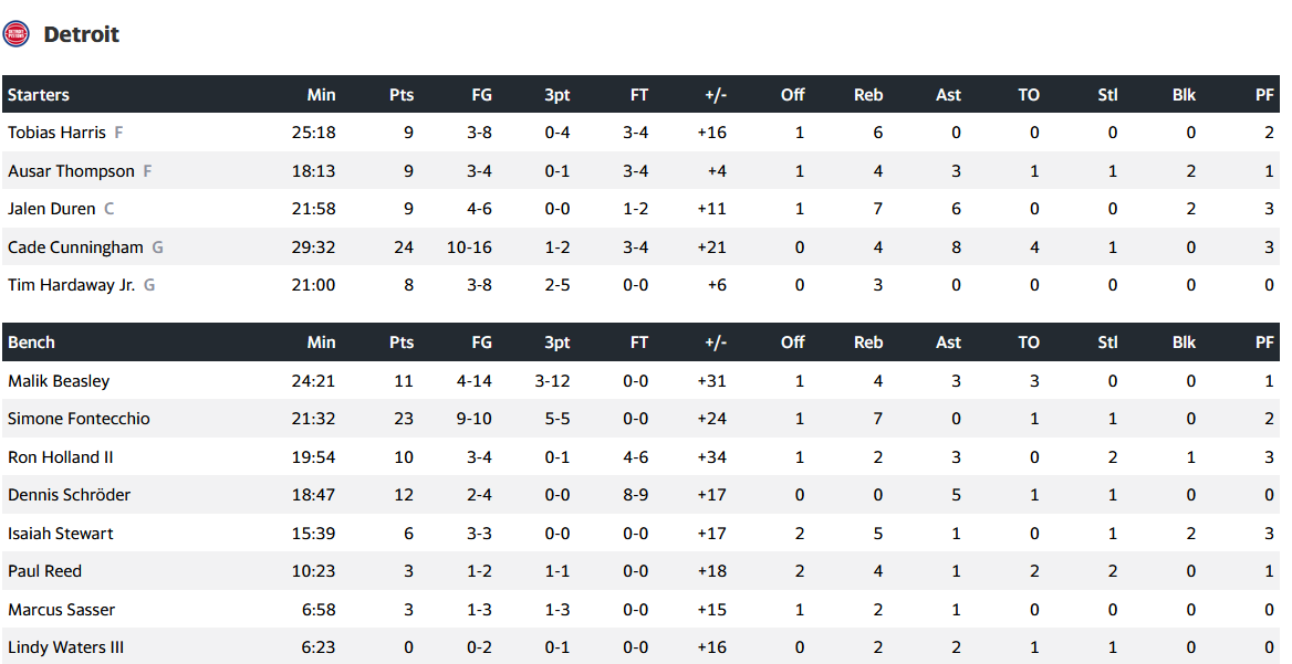 Aπό τη νίκη του Ντιτρόιτ ξεχώρισε ο Κέιντ Κούνινχαμ με 24 πόντους και 8 ασίστ, καθώς και ο Σιμόνε Φοντέκιο με 23 πόντους και 7 ριμπάουντ.