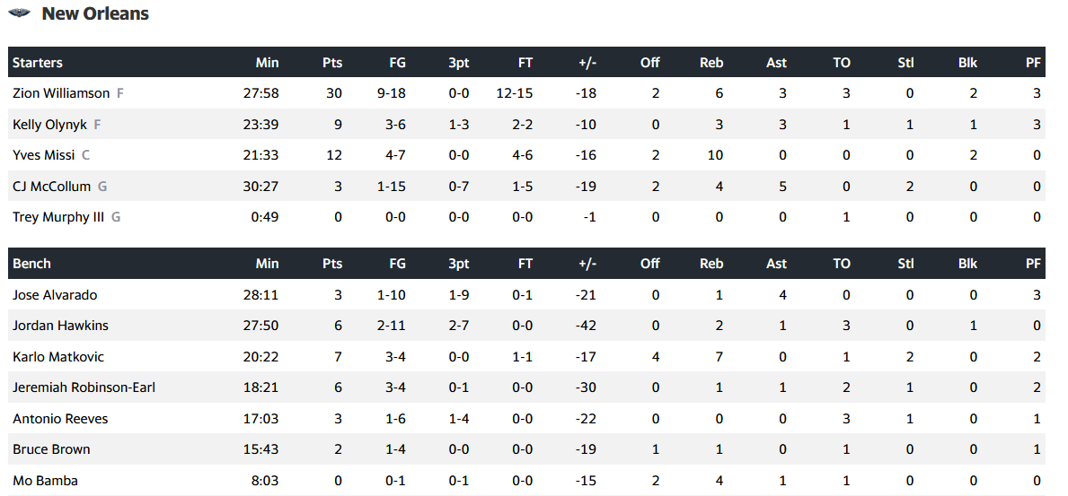 Με την ομάδα της Νέας Ορλεάνης, πολύ καλή εμφάνιση πραγματοποίησε ο Ζίον Γουιλίαμσον με 30 πόντους και 6 ριμπάουντ, ενώ ακολουθεί με διαφορά ο Ιβς Μίσι, που σημείωσε 12 πόντους και 10 ριμπάουντ.