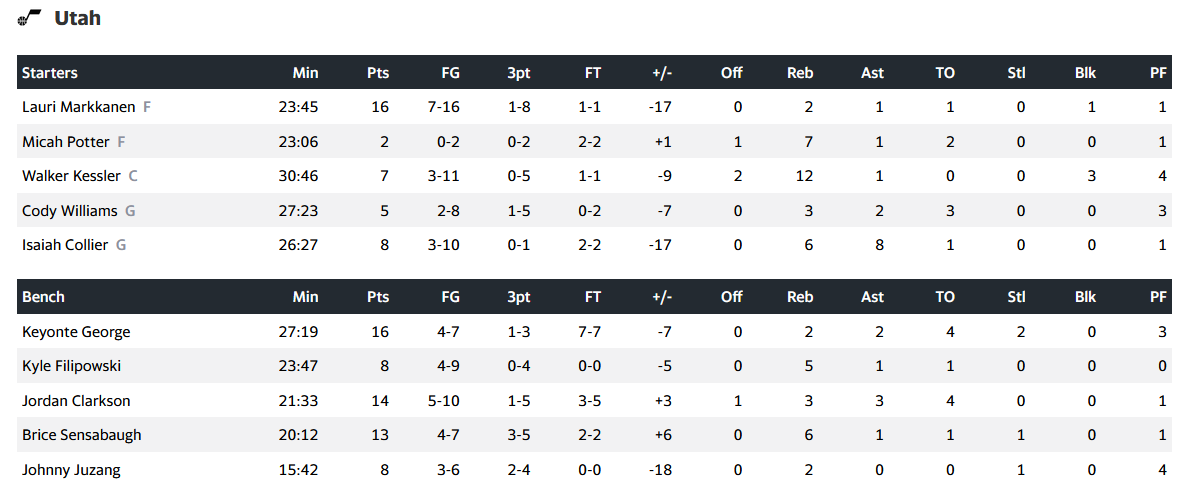 Από την άλλη, από την Γιούτα πολή καλή επίδοση πραγματοποίησαν οι Λάουρι Μαρκκάνεν και Κεγιόντε Τζορτζ με 16 πόντους έκαστος.