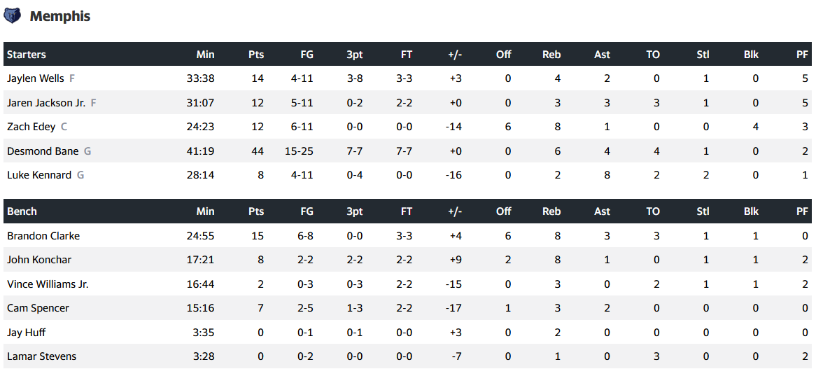 Aπό το Μέμφις ξεχώρισε ο Ντέζμοντ Μπέιν με 44 πόντους και 6 ριμπάουντ, ενώ με διαφορά ακολουθεί ο Μπράντον Κλαρκ με 15 πόντους και8 ριμπάουντ.