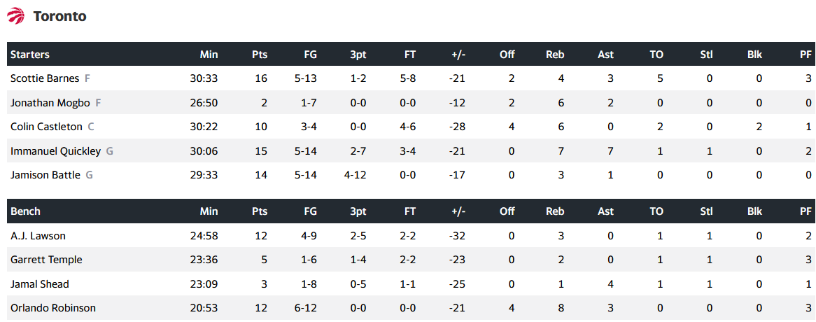 Aπό την ομάδα του Τορόντο ξεχώρισε ο Σκότι Μπάρνς με 16 πόντους και ο Ιμάνουελ Κουίκλι με 15 πόντους και από 7 ασίστ και ριμπάουντ.