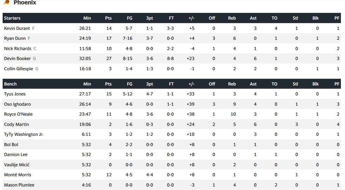 Από τους νικητές, πολύ καλή επίδοση πραγματοποίησε ο Ντέβιν Μπούκερ που πέτυχε 27 πόντους και 6 ασίστ, ενώ ακολουθεί ο Ράιαν Νταν με 17 πόντους και 6 ριμπάουντ.
