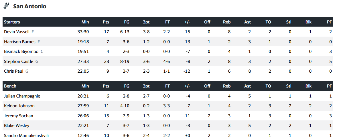 Από την ομάδα των Σπερς ξεχώρισε ο Στέφον Καστλ με 23 πόντους και 8 ριμπάουντ, καθώς και ο Ντέβιν Βασέλ που σημείωσε 17 πόντους και 8 ριμπάουντ.
