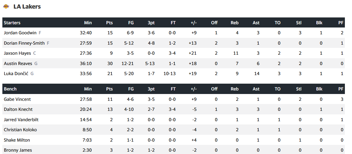 Από τους νικητές πρωταγωνιστής ήταν ο Όστον Ριβς με 30 πόντους, 7 ριμπάουντ και 6 ασίστ, ενώ ακολουθεί ο Λούκα Ντόντσιτς με 21 πόντους, 14 ασίστ και 9 ριμπάουντ.