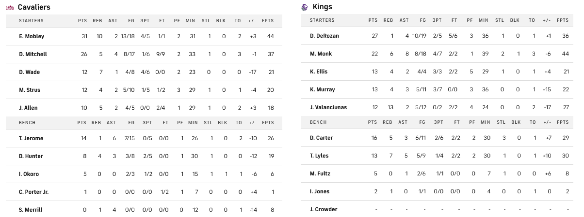 Κορυφαίος για τους νικητές ήταν ο ΝτεΜάρ ΝτεΡόζαν, ο οποίος είχε 27 π΄οντους και 4 ασίστ, με τους Μαλίκ Μονκ (22π, 8ρ, 6ασ) και Ντέβιν Κάρτερ (16π, 5ρ, 3ασ, 3κλ) να προσφέρουν πολύτιμες λύσεις στους «Βασιλιάδες». Από την άλλη πλευρά, αυτοί που ξεχώρισαν από πλευράς φιλοξενούμενων ήταν οι Έβαν Μόμπλι (31π, 10ρ) και Ντόνοβαν Μίτσελ (26π, 5ρ, 4ασ).