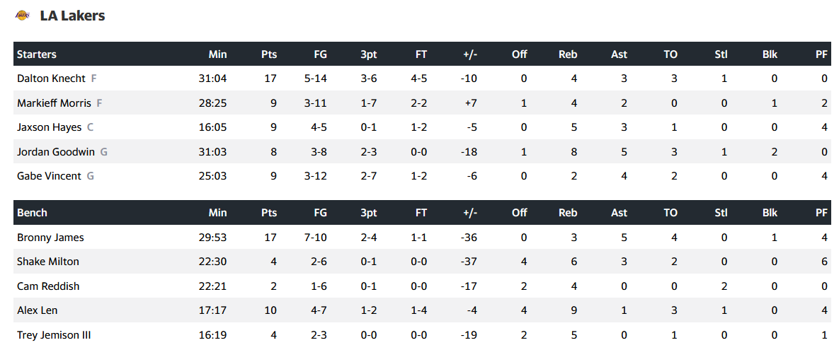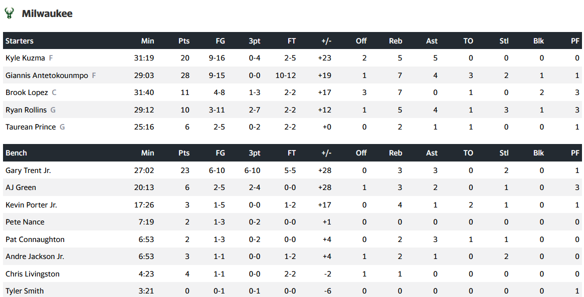 Από τα Ελάφια πρωταγωνιστής ήταν ο Γιάννης Αντετοκούνμπο που πέτυχε 28 πόντους και 7 ριμπάουντ, ενώ ακολουθεί ο Κάιλ Κούζμα με 20 πόντους και από 5 ασίστ και ριμπάουντ.