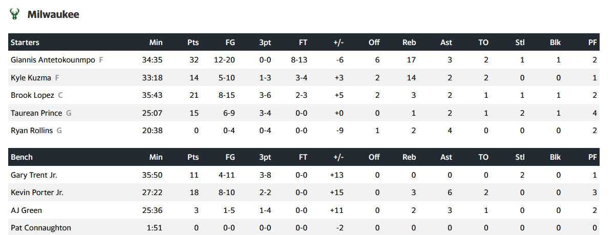Από τα Ελάφια πρωταγωνιστής ήταν ο Greek Freak που πέτυχε 32 πόντους και μάζεψε 17 ριμπάουντ, ενώ ακολουθεί ο Κάιλ Κούζμα με 14 πόντους και 14 ριμπάουντ.