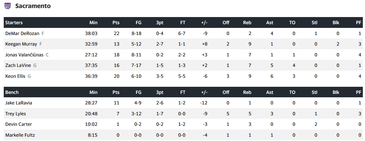 Από την άλλη, ξεχώρισε ο NτιΜαρ ΝτιΡόζαν με 22 πόντους και 4 ριμπάουντ, καθώς και ο Κίον Έλις με 20 πόντους, 9 ριμπάουντ και 6 ασίστ.
