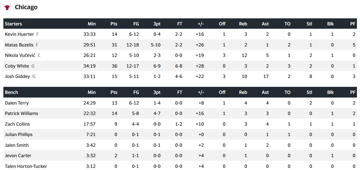 Από τους νικητές ξεχώρισε o Kόντι Γουάιτ με 36 πόντους, ο Μάτας Μπουζέλις με 31 πόντους, καθώς και ο Τζος Γκίντεϊ με 15 πόντους, 10 ριμπάουντ και 17 ασίστ.