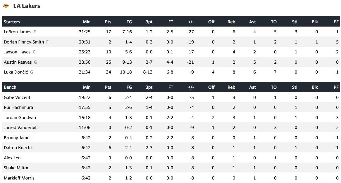 Από την ομ΄αδα του Λος Άντζελες πολύ καλ΄΄η επίδοση σημείωσε ο Λούκα Ντόντσιτς με 34 πόντους, 8 ριμπάουντ και 6 ασίστ, ενώ ακολουθεί ο Όστιν Ριβς με 25 π΄οντους και 5 ριμπάουντ.