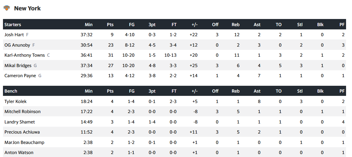 Από τους νικητές, πολύ καλή επίδοση πραγματοποίησε ο Καρλ-Άντονι Τάουνς με 31 πόντους και 11 ριμπάουντ, καθώς και ο Μίκαλ Μπριτζ με 27 πόντους και 6 ριμπάουντ.
