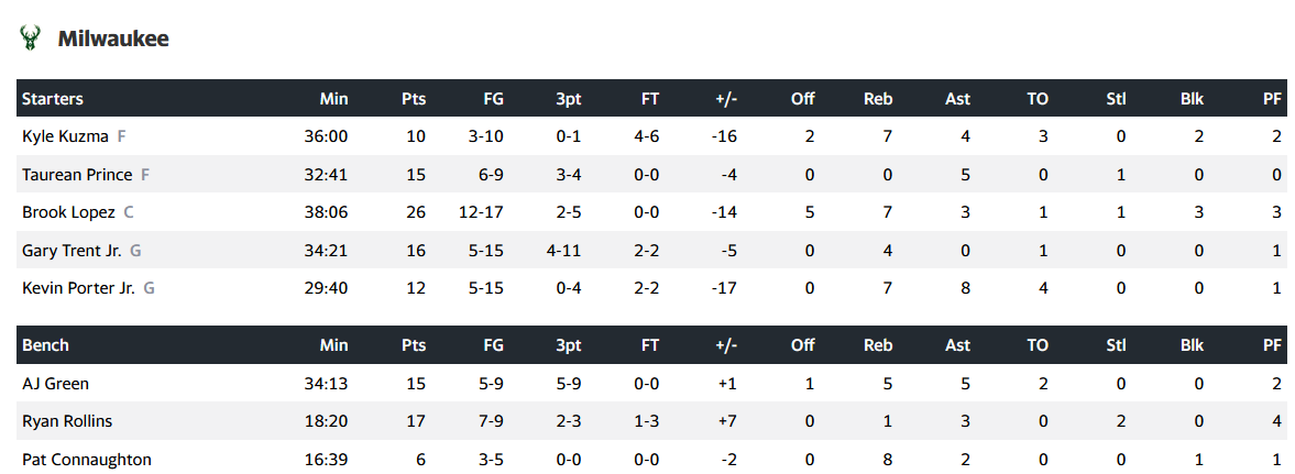 Από τα Ελάφια ξεχώρισε ο Μπρουκ Λόπεζ με 26 πόντους και 7 ριμπάουντ, καθώς και ο Κέβιν Πόρτερ Τζούνιορ με 12 πόντους, 7 ριμπάουντ και 8 ασίστ.