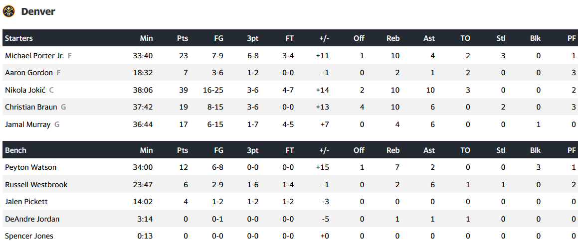 Πρωταγωνιστής του Ντένβερ ο Νίκολα Γιόκιτς, που πέτυχε 39 πόντους και από 10 ασίστ και ριμπάουντ, σημειώνοντας ακόμα ένα triple-double στην καριέρα του, ενώ ακολουθεί ο Μάικλ Πόρτερ Τζούνιορ με 23 πόντους και 10 ριμπάουντ.