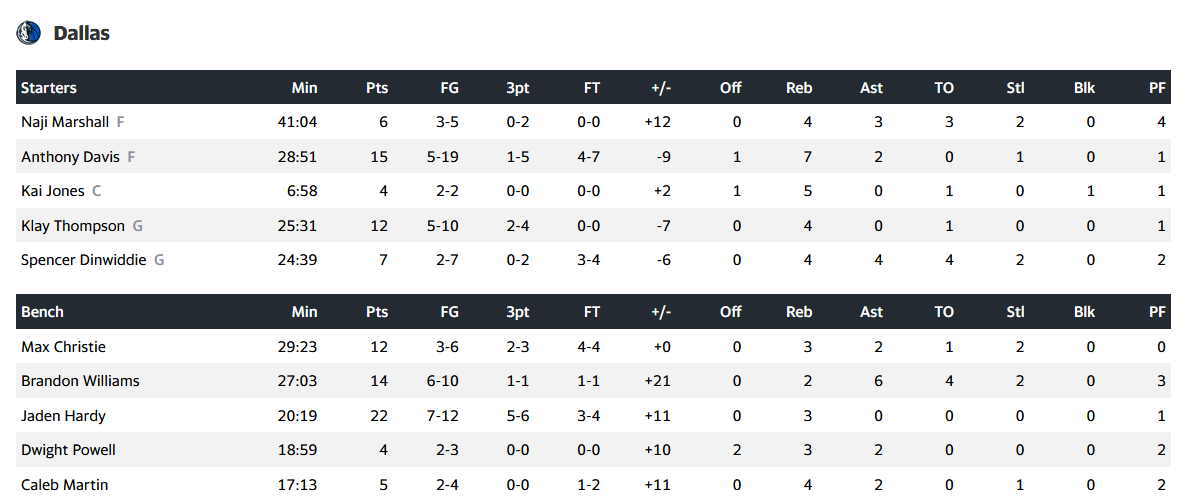 Από το Ντ΄αλας ξεχώρισε ο Τζέιντεν Χάρντι που πέτυχε 22 πόντους, καθώς και ο Άντονι Ντέιβις με 15 πόντους και 7 ριμπάουντ.