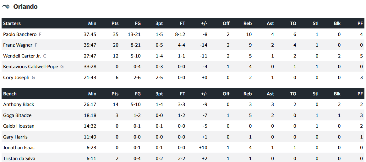 Από τους Μάτζικ, πολύ καλή επίδοση σημείωσε ο Πάολο Μπανκερό με 35 πόντους και 10 ριμπάουντ, ενώ ακολουθεί ο Φραντζ Γουάνγκερ με 20 πόντους και 9 ριμπάουντ.