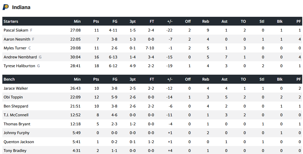 Πολύ καλή επίδοση από τους Πέισερς σημείωσε ο Ταϊρίζ Χάλιμπερτον με 18 πόντους και ο Άντριου Νέμπαρντ με 16 πόντους, 7 ασίστ και 5 ριμπάουντ.