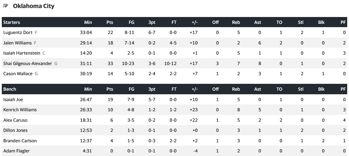 Από τους νικητές, ο Σάι Γκίλτζεους-Αλεξάντερ ήταν κορυφαίος με 33 πόντους, 8 ασίστ και 7 ριμπάουντ, ενώ ακολουθεί ο Λούγκεντζ Ντορτ με 22 πόντους και 5 ριμπάουντ.