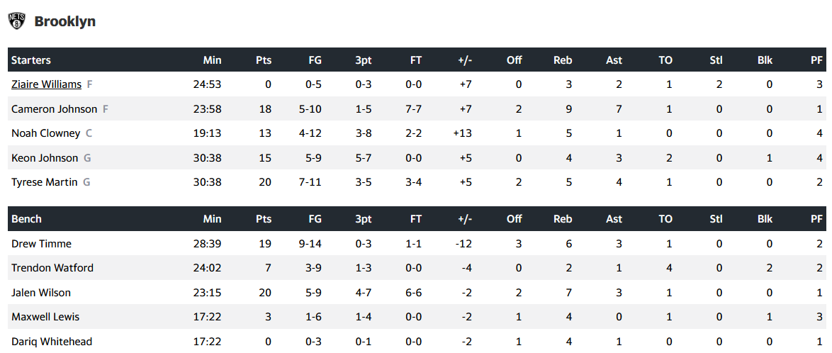 Από το Μπρούκλιν ξεχώρισε ο Τζέιλεν Γουίλσον με 20 πόντους και 7 ριμπάουντ, καθώς και ο Ταϊρίζ Μάρτιν με επίσης 20 πόντους και 5 ριμπάουντ.