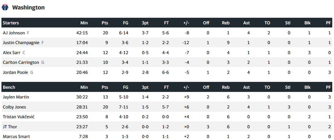 Πολύ καλή επίδοση για τους Μάγους, σημείωσε ο Έι Τζι Τζόνσον με 20 πόντους και ο Κόλμπι Τζόουνς με επίσης 20 πόντους.