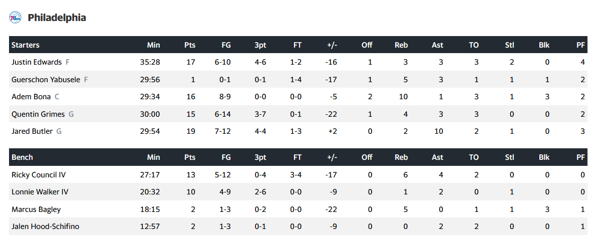 Από την ομάδα της Φιλαδέλφια, ξεχώρισε ο Τζάρεντ Μπάτλερ με 19 πόντους και 10 ασίστ και ο Άμπεμ Μπόνα με 16 πόντους και 10 ριμπάουντ.