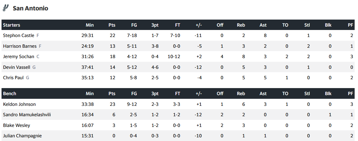 Από την άλλη, από το Σαν Αντόνιο ξεχώρισε ο Κέλντον Τζόνσον με 23 πόντους και 6 ριμπάουντ, καθώς και ο Στέφον Καστλ με 23 πόντους και 8 ασίστ.