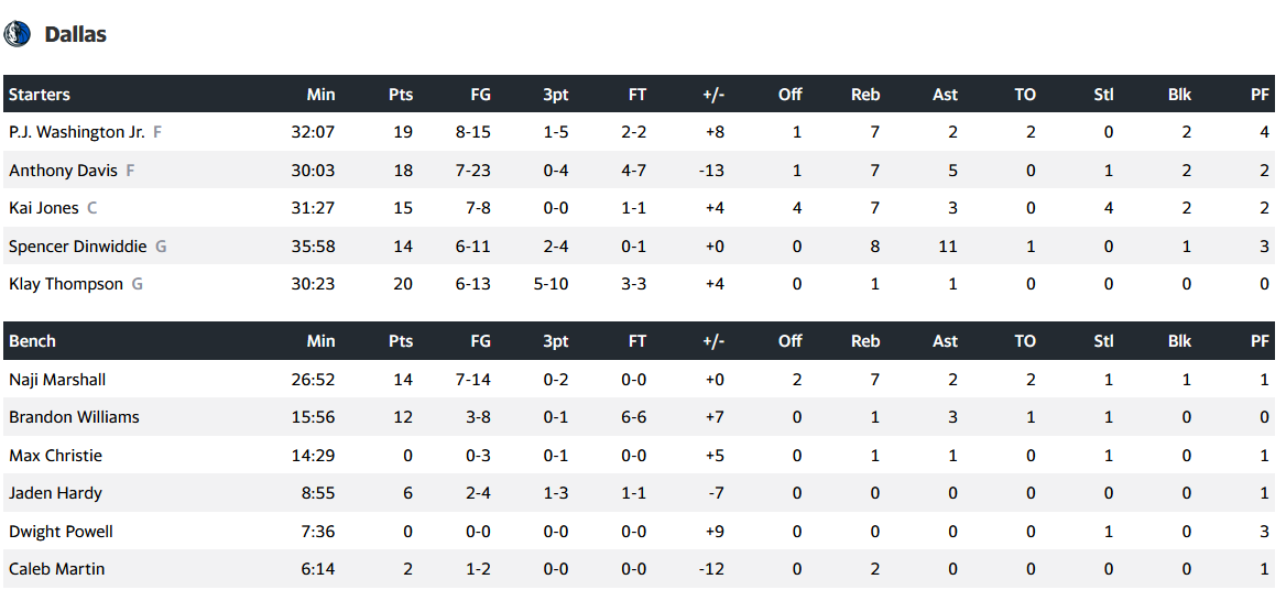 Από τους νικητές, το Ντάλας πρωταγωνιστής ήταν ο Κλέι Τόμπσον με 20 πόντους και ο Σπένσερ Ντινγουίντι με 14 πόντους, 11 ασίστ και 8 ριμπάουντ.