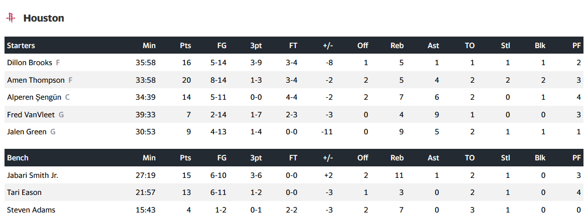 Από το Χιούστον ξεχώρισε ο Άμεν Τόμπσον με 20 πόντους και 5 ριμπάουντ, καθώς και ο Τζάμπαρι Σμιθ Τζούνιορ με 15 πόντους και 11 ριμπάουντ.