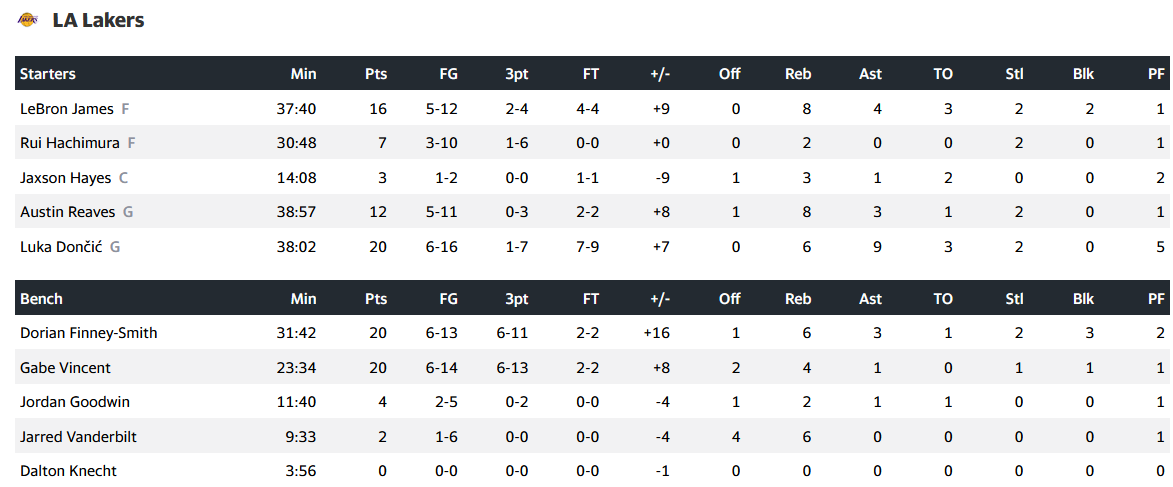 Από τους νικητές, πρωταγωνιστής ήταν ο Λούκα Ντόντσιτς με 20 πόντους, 9 ασίστ και 6 ριμπάουντ και ακολουθεί ο Λεμπρόν Τζέιμς με 16 πόντους και 8 ριμπάουντ.