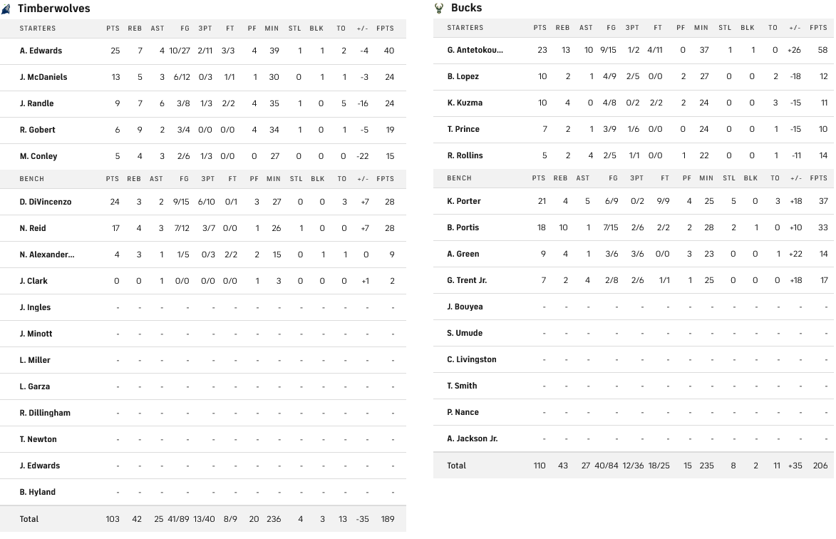 Ο «Greek Freak» πέτυχε το τρίτο συνεχόμενο triple double του με 23 πόντους, 13 ριμπάουντ και 10 ασίστ, πετυχαίνοντας, μάλιστα και τρίποντο, στο μυθικό 23-0 που μετέτρεψε το 71-95 σε 94-95, σερί το οποίο έβαλε τις βάσεις για την μεγάλη ανατροπή.