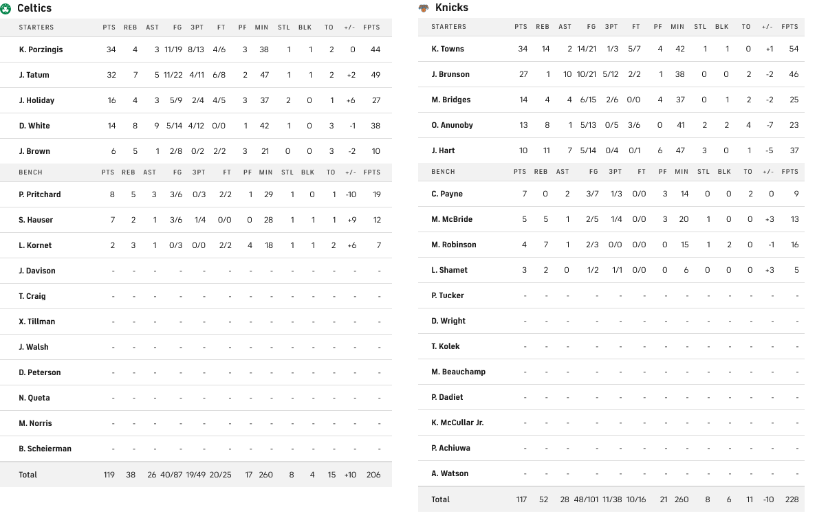 Για τους Νικς ο Τάουνς είχε 34 πόντους και 13 ριμπάουντ, με τον Μπράνσον να έχει 27 πόντους και 10 ασίστ.