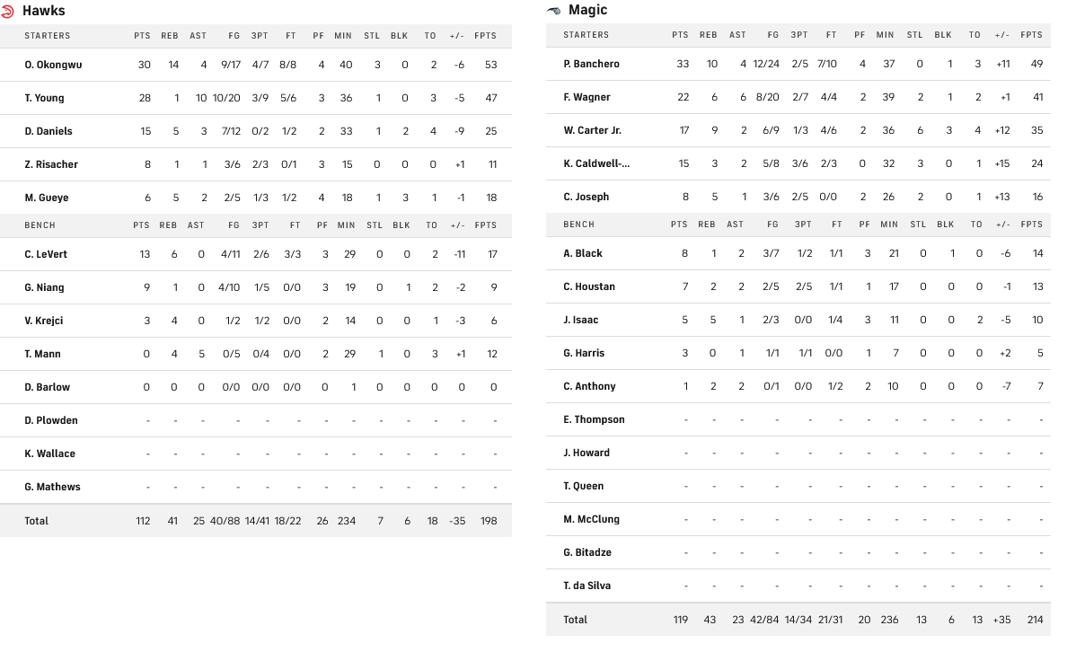 Νίκη για τους Μάτζικ με 119-112 απέναντι στους Χοκς, με τον Μπακέρο να είναι ασταμάτητος, με 33 πόντους και 10 ριμπάουντ, την ώρα που ο Βάγκνερ είχε 22 πόντους και ο Κάρτερ 17 πόντους και εννέα ριμπάουντ.