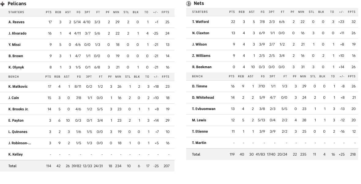 Τέλος, νικηφόρα συνέχισαν και οι Νετς, που επιβλήθηκαν των Πέλικανς με 119-114. 22 πόντους είχε ο Γουότφορντ, με τον Τίμε να προσθέτει 16 πόντους και εννέα ριμπάουντ, ενώ για τους Πέλικανς, Ριβς και Μάτκοβιτς είχαν από 17 πόντους έκαστος, με τον Αλβαράντο να προσθέτει 16 πόντους.