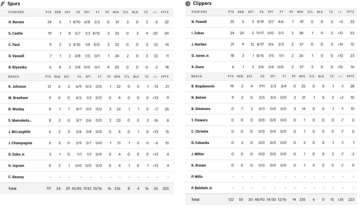 Δύσκολη νίκη για τους Κλίπερς απέναντι στους Σπερς, όπως δείχνει το τελικό 122-117. 25 πόντους πέτυχε ο Πάουελ, με τον Ζούμπατς να κάνει ένα εντυπωσιακό double – double με 24 πόντους και 20 ριμπάουντ, ενώ ο Χάρντεν… άγγιξε το triple double, με 21 πόντους, 12 ασίστ και εννέα ριμπάουντ. Για τους Σπερς, ο Μπαρνς είχε 24 πόντους και ο Καστλ 19.