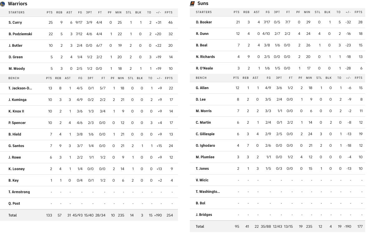 Απολαυστικός ο Κάρι με 25 πόντους, με τον Ποντζιέμσκι να προσθέτει 22, ενώ για τους Σανς, που αγωνίστηκαν και πάλι χωρίς τον Ντουράντ, ο Μπούκερ είχε 21 πόντους.
