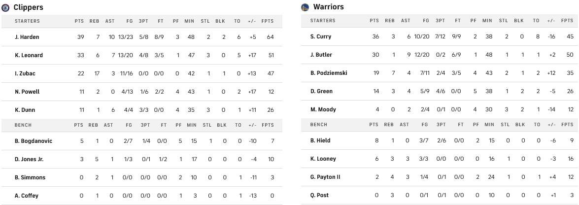 Το θρίλερ της βραδι΄άς έγινε στο Γκόλντεν Στέιτ, όπου οι Κλίπερς στο έξτρα πεντάλεπτο της παράτασης επικράτησαν των Γουόριορς χάρη στο ασταμάτητο δίδυμο Χάρντεν και Λέοναρντ που είχε 39 και 33 πόντους αντίστοιχα, με τους γηπεδούχους να τα περιμένουν όλα από τους Κάρι και Μπάτλερ που είχαν 36 και 30.