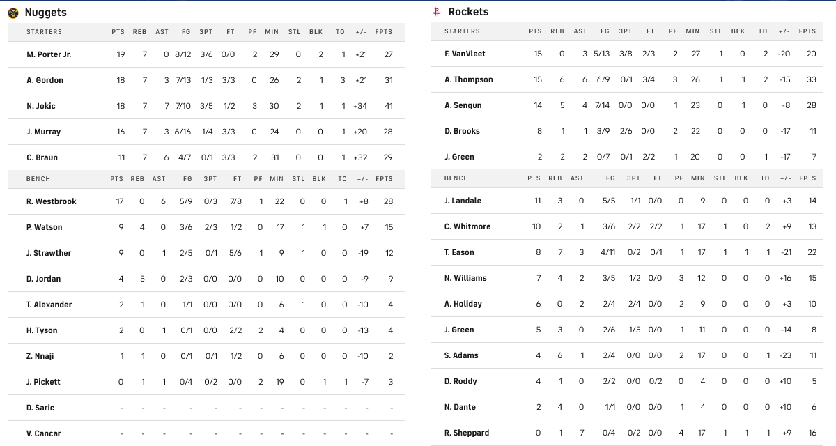 Μεγάλο διπλό για το Ντένβερ όπου και κατάφερε να «αλώσει» το Χιούστον, χάρη στους Πόρτερ, Γκόρντον και Γιόκιτς που είχαν από 19, 18 και 18 αντίστοιχα. Από τους γηπεδούχους πρώτοι σκόρερ ήταν οι ΒανΒλιτ και Τόμπσον με 15.