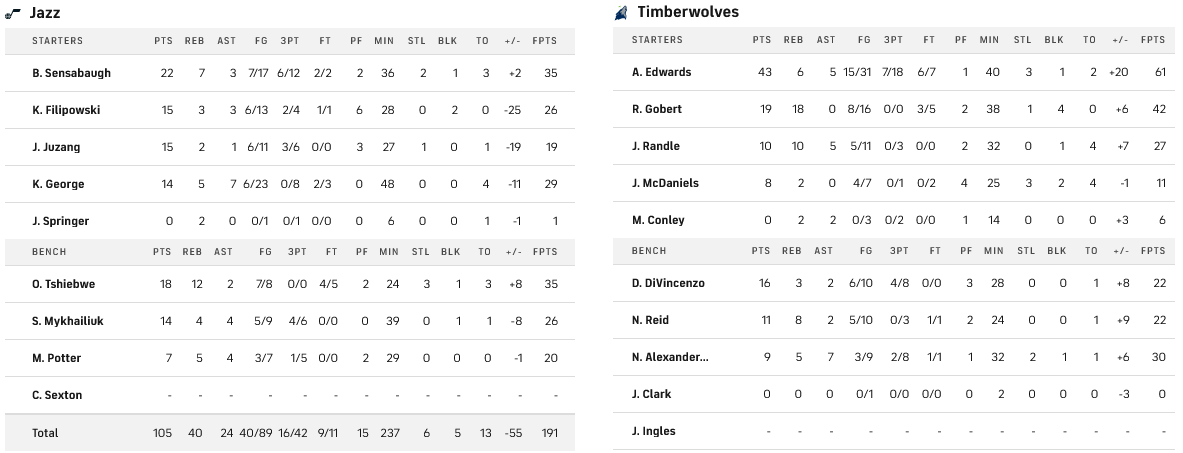 Οι Τίμπεργουλβς έκαναν αυτό που έπρεπε, πήραν τη νίκη απέναντι στους Τζαζ με ηγετική εμφάνιση Έντουαρντς που σταμάτησε στους 43 πόντους, με τον Γκομπέρ να προσθ΄ετει ακόμη 19. Από τη Γιούτα διακρίθηκε ο Σένσαμπο με 22.