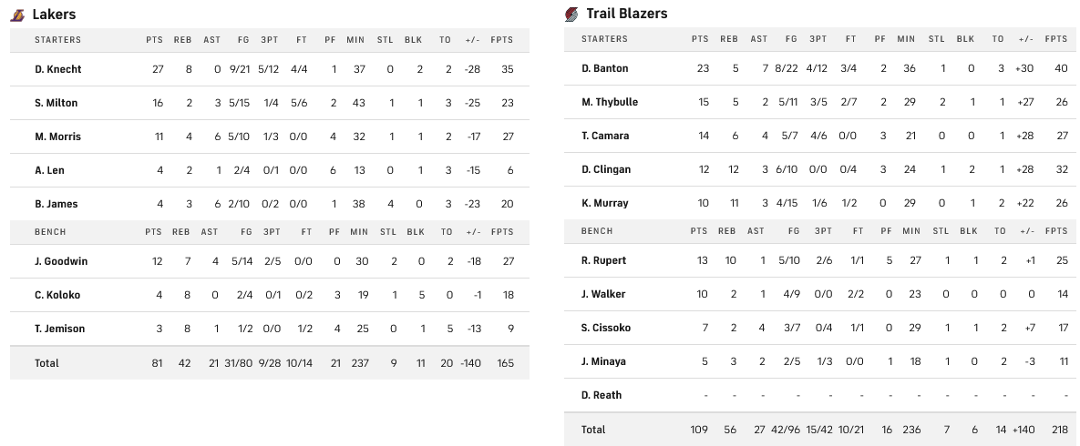 Το Πόρτλαντ διέλυσε τον πάγκο των Λέικερς, με τους Μπάντον και Τάιμπουλ να οδηγούν επιθετικά τους Μπλ΄΄ειζερς με 23 και 15 πόντους αντίστοιχα. Από το Λος Άντζελες ξεχώρισε ο Κνεχτ με 27.