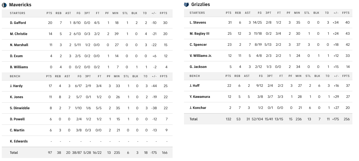Οι Γκρίζλις διέσυραν τους Μάβερικς, έχοντας σε πολύ καλό βράδυ τους Στίβενς (31π), Μπάγκλι (25π), Σπένσερ (23π) και Χαφ (22π). Μοναδικός διασωθέντας από το Ντάλας ο Γκάφορντ με 20.