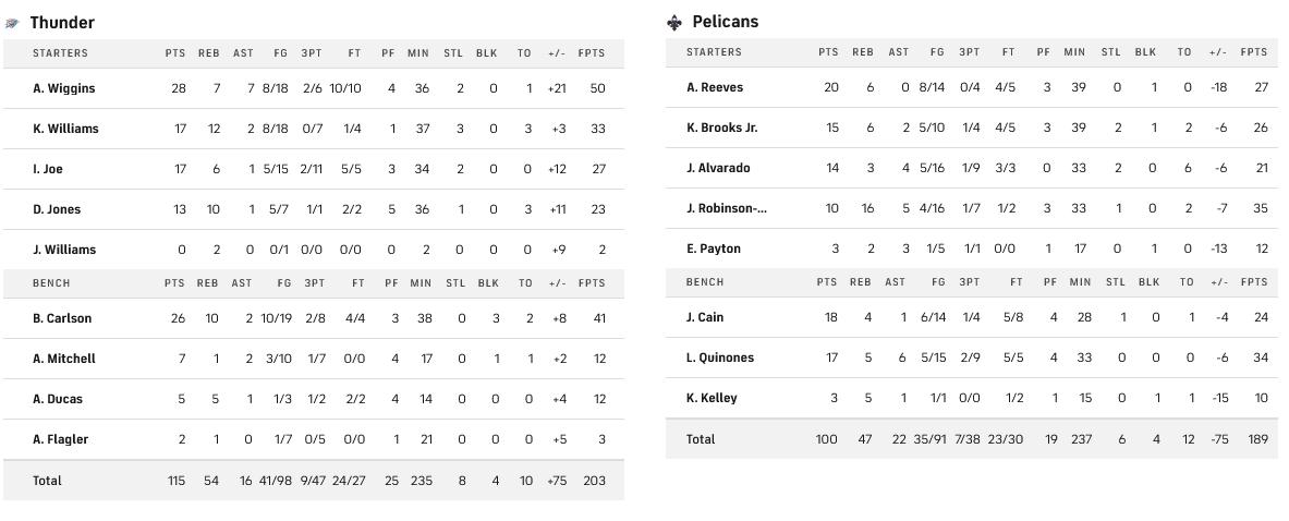 Οι Θάντερ έκαναν το αναμενόμενο και πέρασαν νικηφόρα από την έδρα των Πέλικανς, με μπροστάρη τον εξαιρετικό Γουίγκινς που πέτυχε 28 πόντους, αλλά και τον Κάρλσον που πρόσθεσε 26. Από τους γηπεδούχους 20 είχε ο Ριβς.